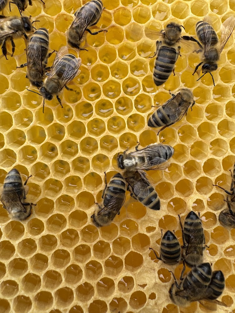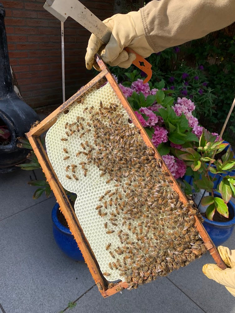 Deze afbeelding toont een raam uit een van onze bijenkasten waarop onze bijen prachtige raathoning bouwen. De wilde, witte bijenwas wordt door de bijen zelf geproduceerd en zorgvuldig gevuld met nectar uit de omgeving. In de raten rijpt de honing op natuurlijke wijze. Raathoning is puur natuur: de bijen verwerken de nectar zonder menselijke tussenkomst tot een heerlijke lekkernij, rechtstreeks uit de natuur.